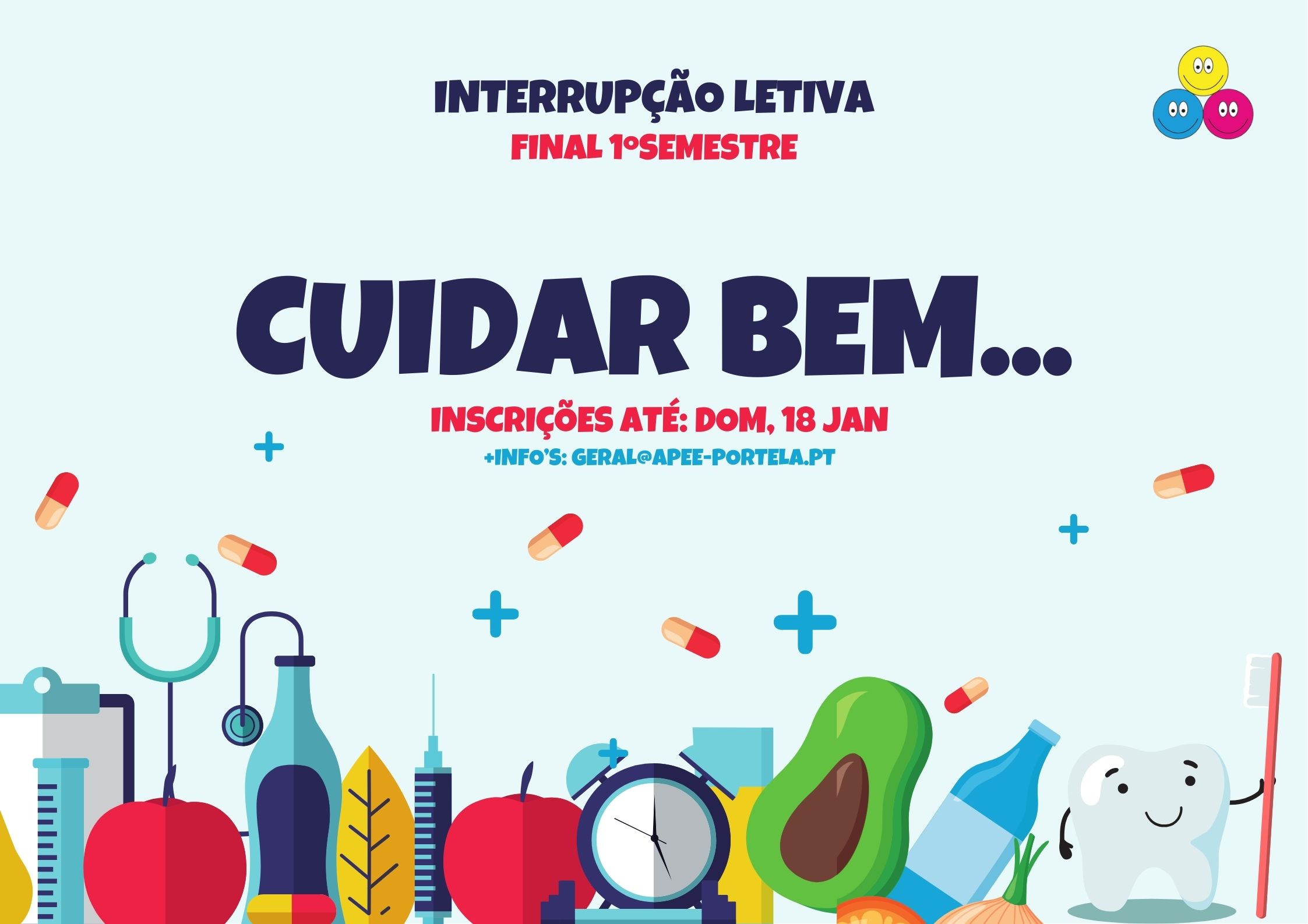 As inscrições para a interrupção letiva do final de semestre já se encontram abertas. Para mais informações, enviar e-mail para geral@apee-portela.pt